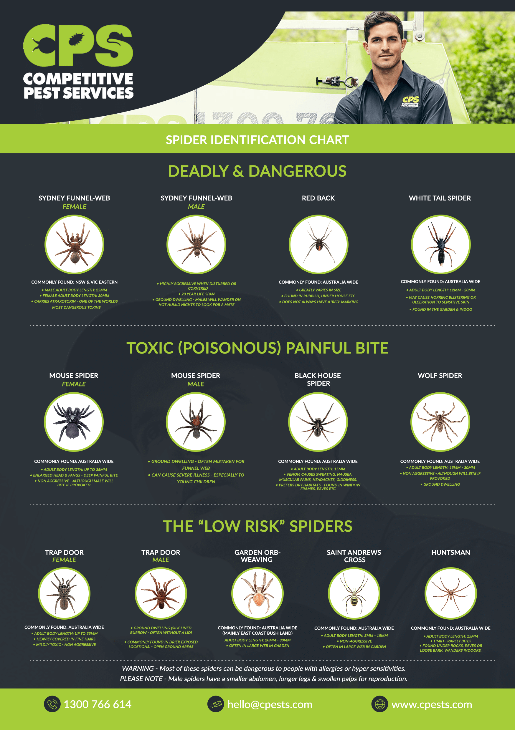 Don’t forget to print out our Competitive Pest Services Spider Chart for your fridge! Please find in a downloadable format below. Not only is it educational for the family, but could also potentially be life saving. SPIDER IDENTIFICATION CHART